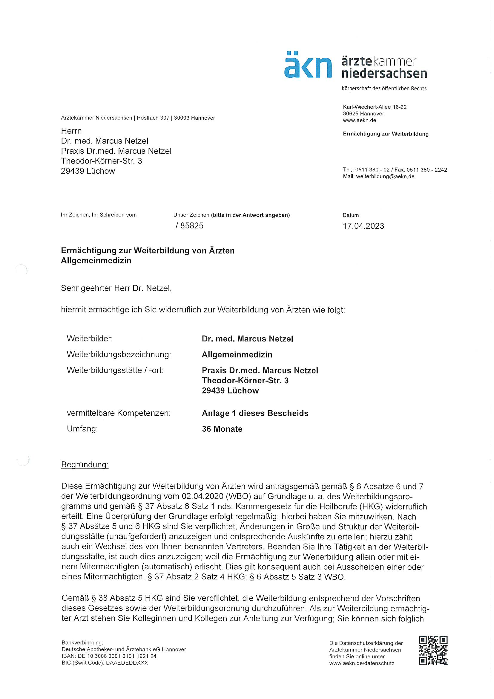 Da wir in unserer Praxis ein großes Spektrum an Leitungen in verschiedenen Fachbereichen vorhalten, wurde die Weiterbildungsermächtigung durch die Ärztekammer Niedersachsen mit Bescheid vom 17.04.23 von 24 auf 36 Monate deutlich verlängert.