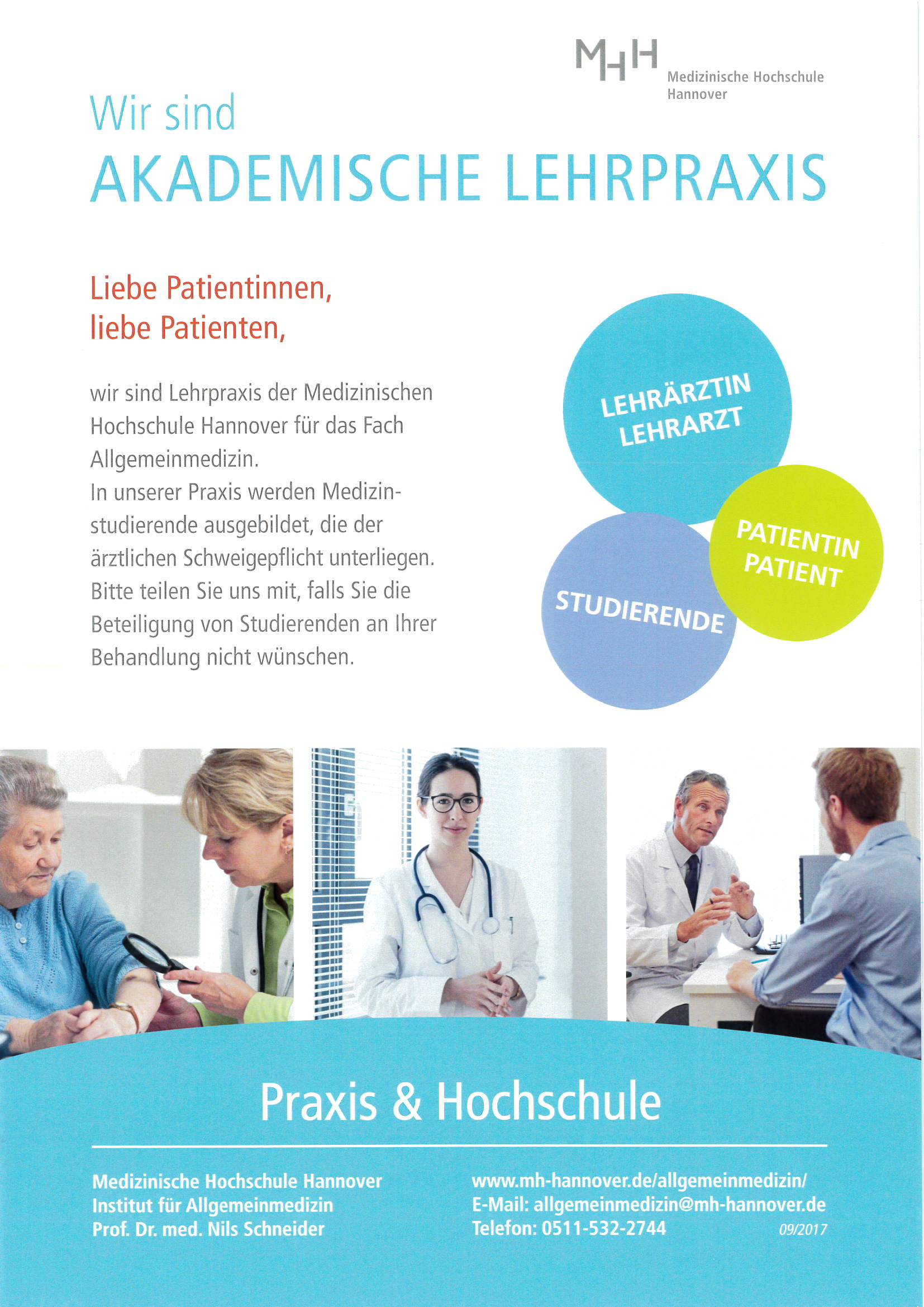 Zudem wurde unsere Praxis als Akademische Lehrpraxis für die Universitäten MHH Hannover und Eppendorf Hamburg bestätigt. Bein uns können bereits während des Studiums Praktika und Kurse absolviert werden.